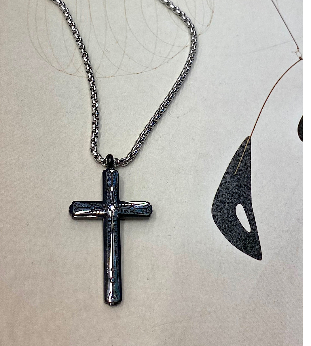 Ατσάλινος σταυρός σε μαύρο γκρι με χαραγμένη επιφάνεια και μικρό στρασάκι Σε αλυσίδα ατσάλινη 52 εκ.