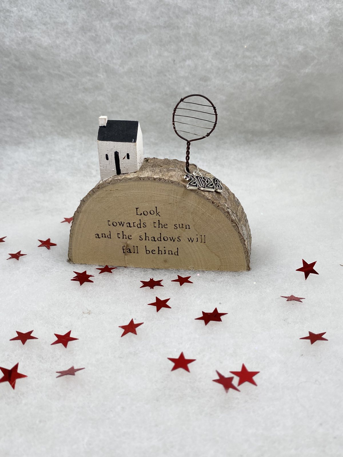 Ξύλινο χειροποίητο γούρι, λόφος με σπίτι και δέντρο Επιγραφή “Look towards the sun and the shadows will fall behind”