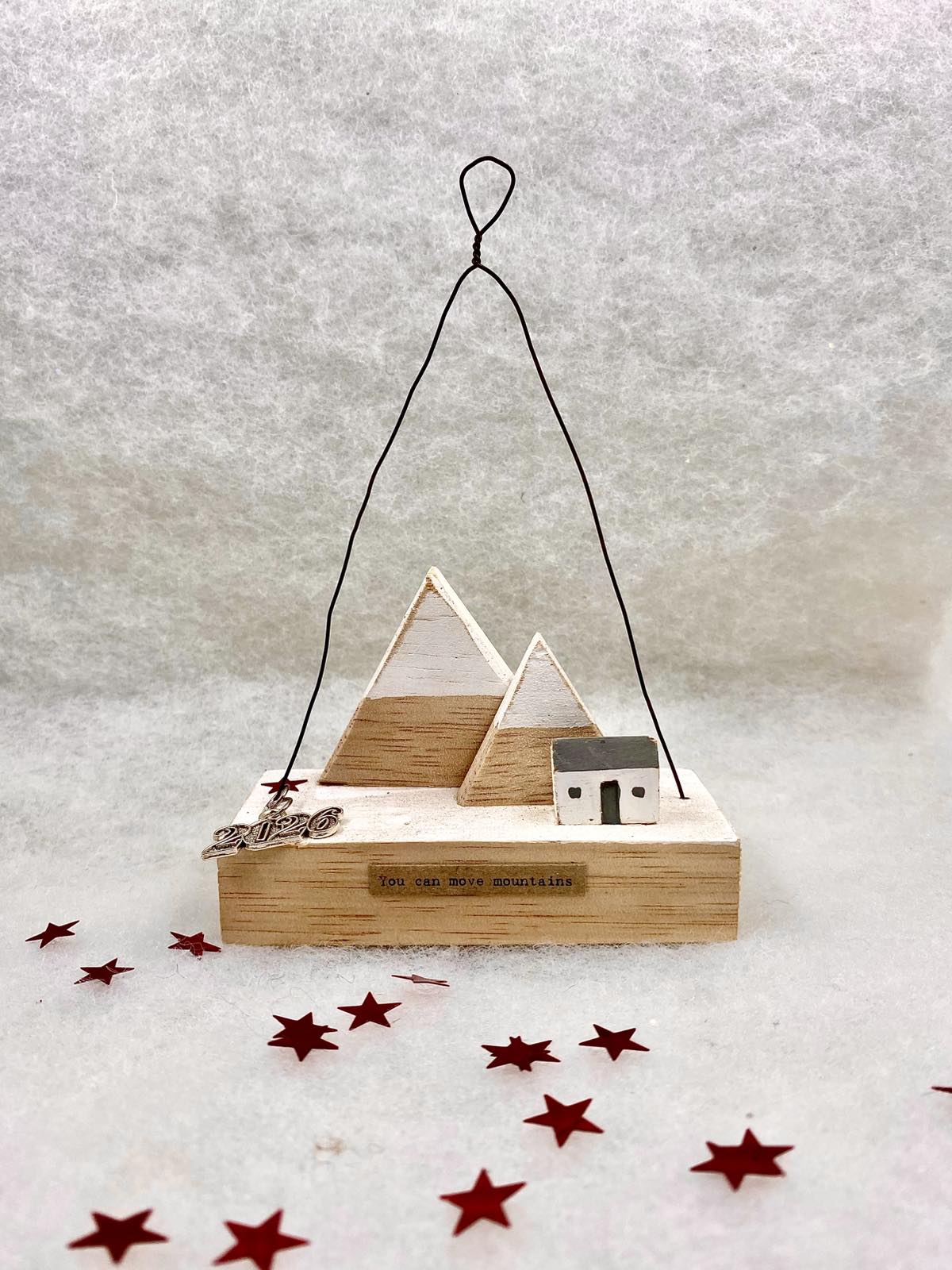 Ξύλινο, χειροποίητο γούρι, σπιτάκι και βουνά επιγραφή “You can move mountains”