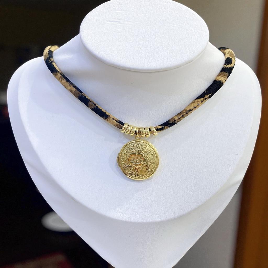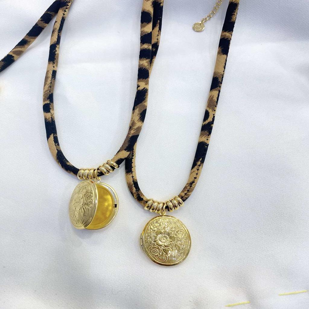 Ανοιγόμενο, οβάλ κολιέ ατσάλινο με λεοπάρ ύφασμα