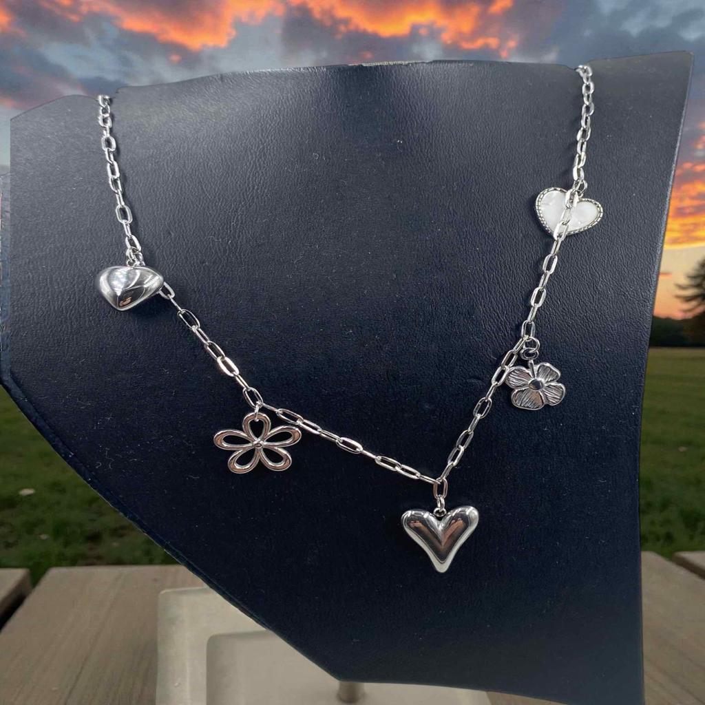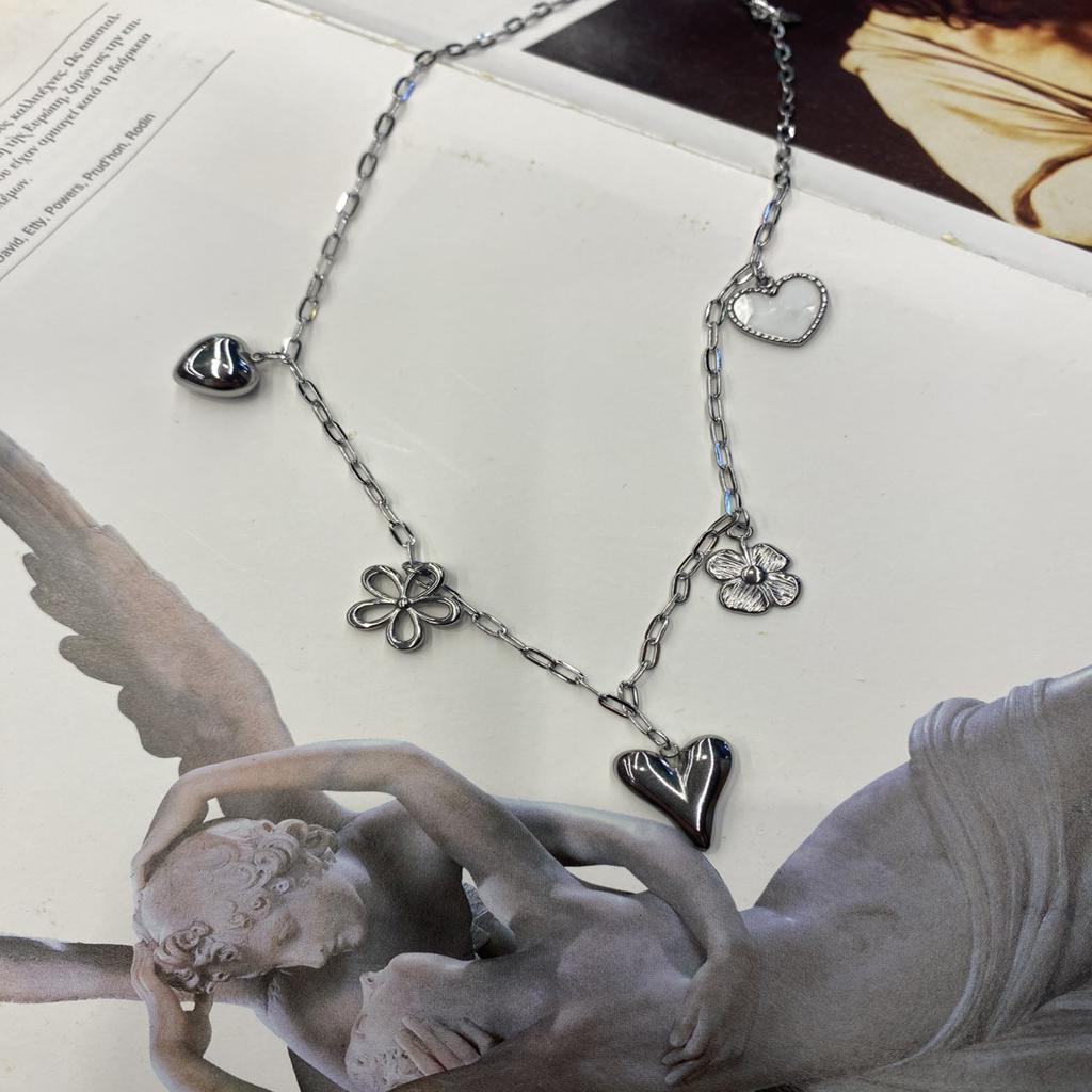 Κολιέ ατσάλινο, με κρεμαστά στοιχεία καρδιές και λουλούδια