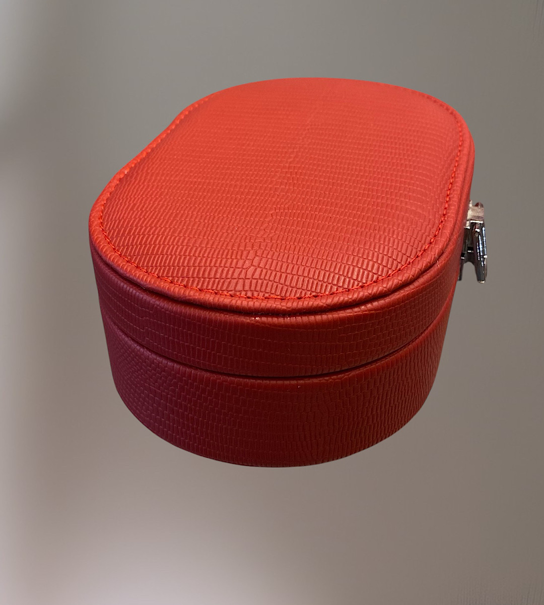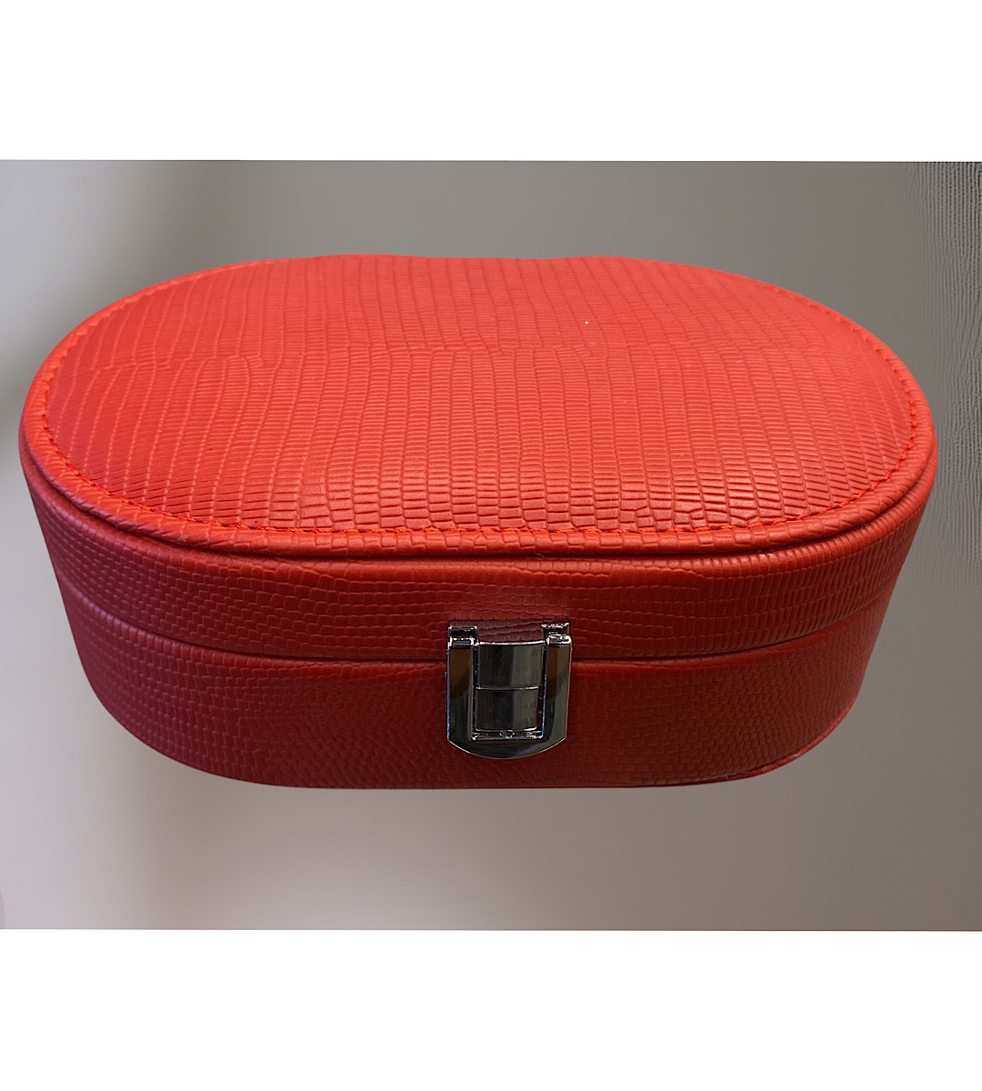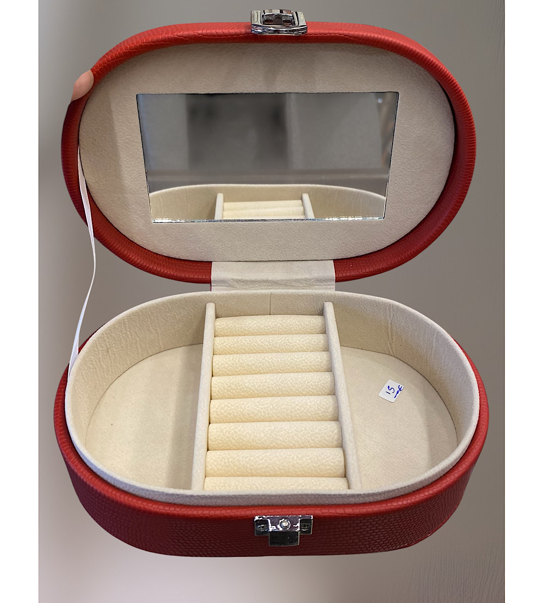 Κόκκινη μπιζουτιέρα από τεχνόδερμα με χώρους εσωτερικά για κάθε κόσμημα και καθρέφτη στο καπάκι
