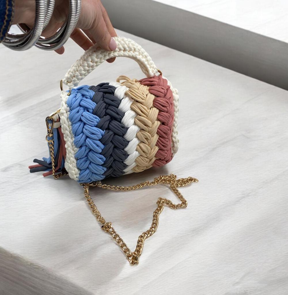 Τσάντα γυναικεία, πλεκτή, πολύχρωμη, με χερούλι και χρυσή αλυσίδα